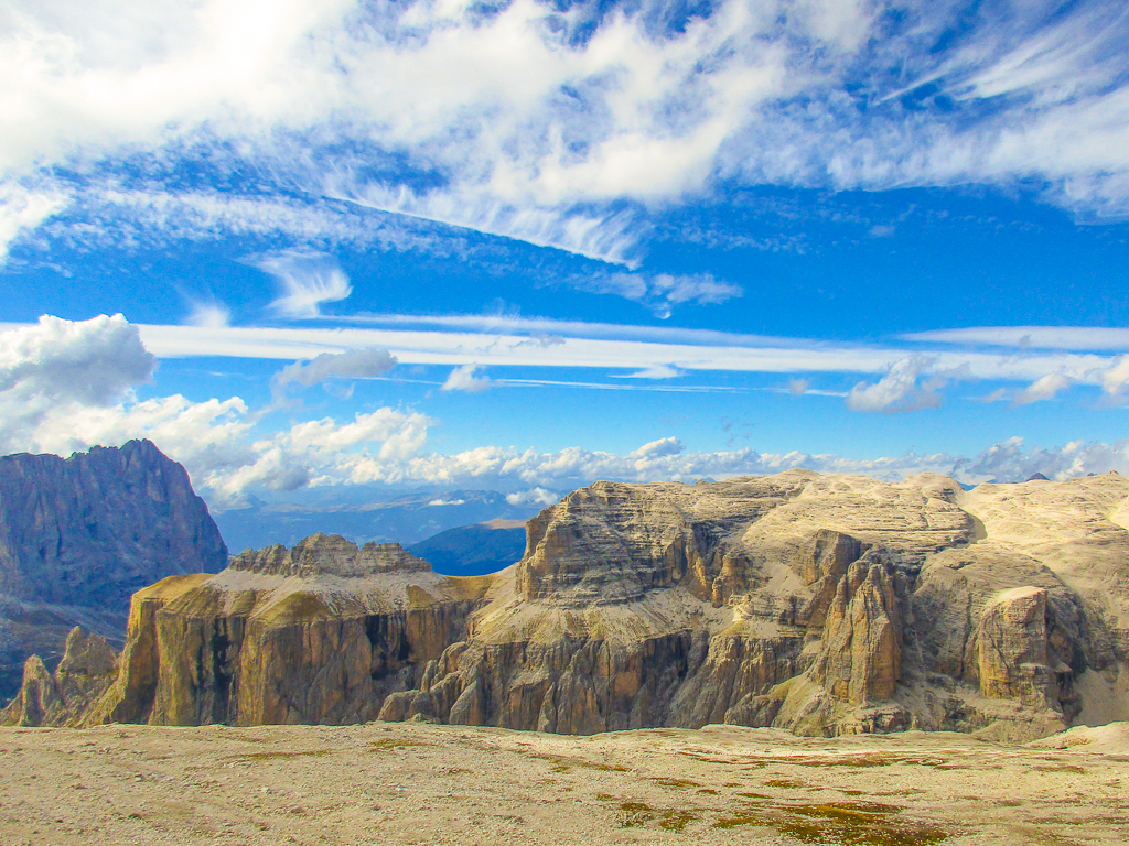 Heute ist der letzte Tag. Und auch ein einfacher Tag, aber nicht weniger beeindruckend. Du wanderst zunächst über das Sellamassiv zum Rifugio Boè. Obwohl die Alta Via #2 geradeaus weitergeht, empfehlen wir Ihnen, einen Abstecher (ca. 1 Stunde extra) zum Gipfel des Piz Boè zu machen, wo sich auch das Rifugio Fassa befindet. Danach sanfter Abstieg zur Endstation der Seilbahn am Passo Pordoi. Und Sie können wählen, ob Sie mit der Seilbahn nach unten fahren oder die 600 Höhenmeter zu Fuß hinabsteigen.